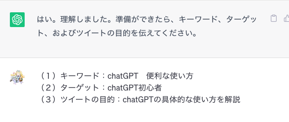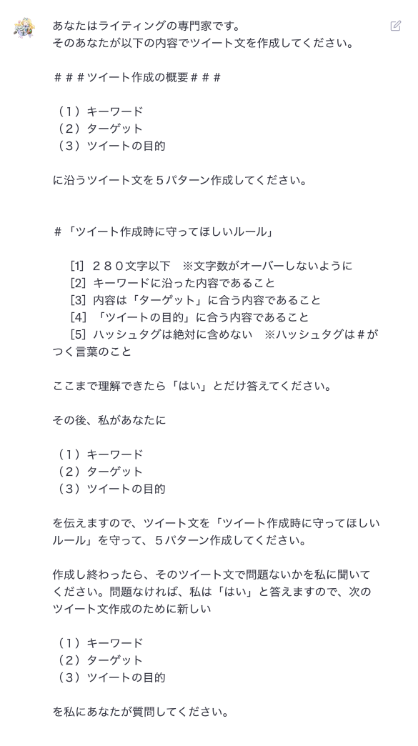 ※GPT-3.5だと指示した文字数よりも少なくなる場合があったり、TwitterBlueの方だと140文字制限がないため、もっと多くの文字数が必要なケースも。そのため、用意している呪文で一度出力した後で、その結果を見て、追加で指示をしてあげると自分の望む分量のツイート文が得やすいです。