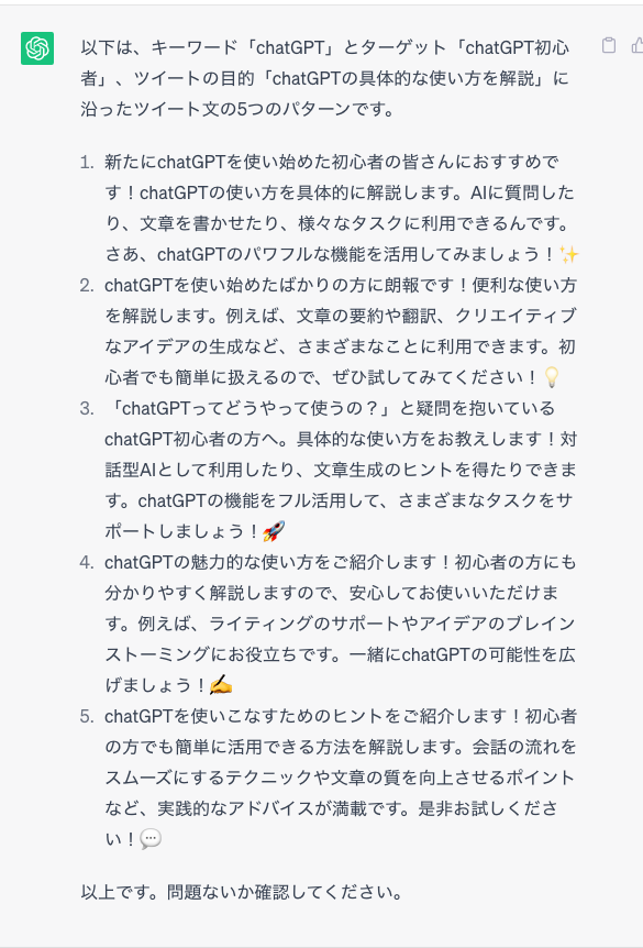 そうしたら、chatGPTがツイート文の例を5つ返してくれました。