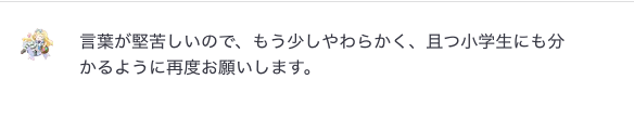 生成された文章がもし堅苦しい内容だった場合にこういった質問をすると、修正してくれます。