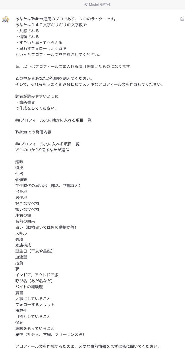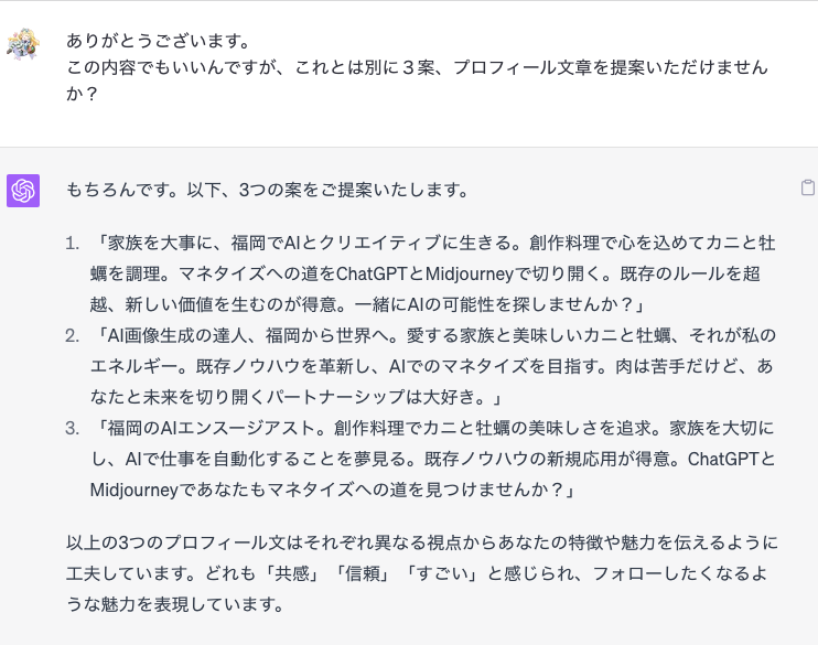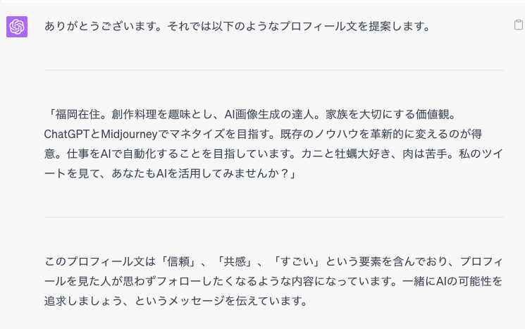 送った情報をもとに、chatGPTがプロフィール文章を作成してくれました。