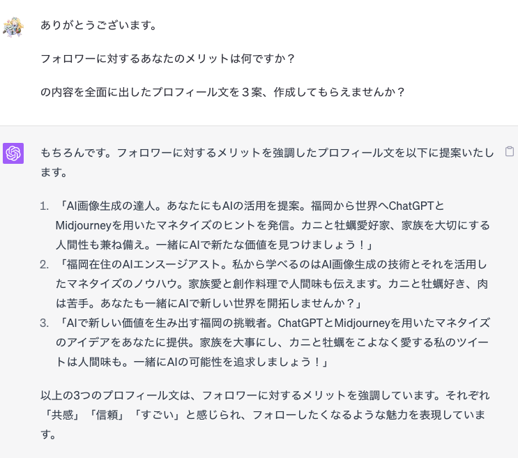 例)フォロワーにどんなメリットがあるかを強調したプロフィール文の作成をするパターン