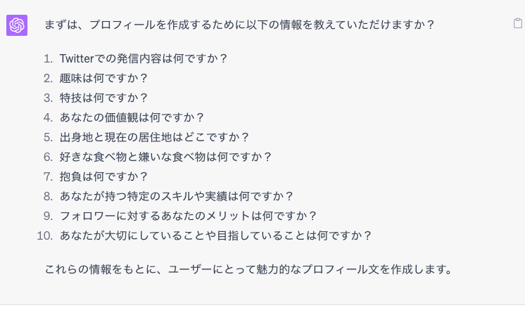 プロフィール文を作成するために、必要な事前情報をまずは私に聞いてください。