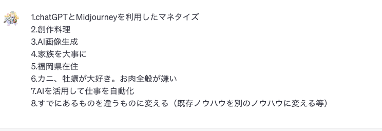 尚、回答の前に項目の番号を入力してあげると、chatGPTに伝わりやすいです。