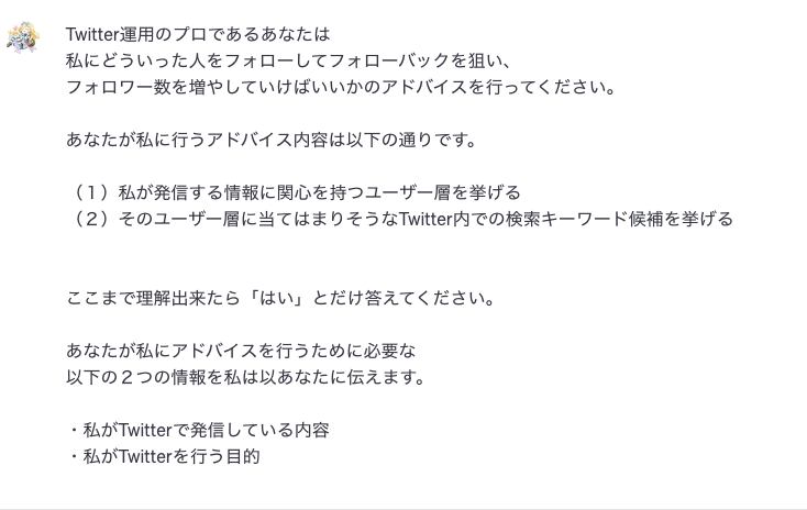 貼り付けると、ChatGPTがきちんと理解してくれていたら「はい」と返事をしてくれます。