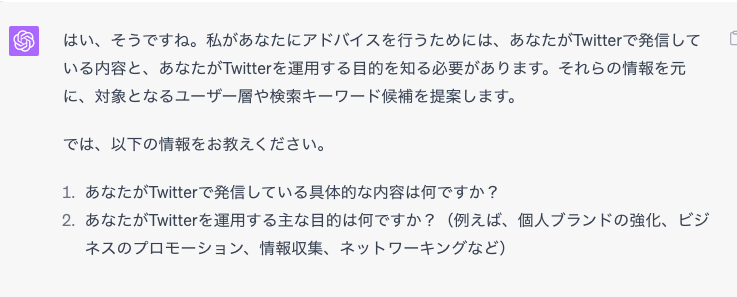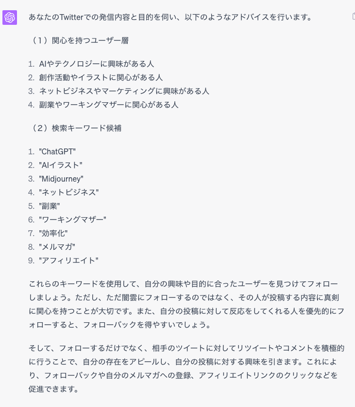 すると、chatGPTがどういったユーザーが自分が発信する情報に興味・関心をもってくれるかを挙げてくれ、それに関連するキーワードも挙げてくれました。