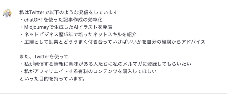 そうしたら、あなたの「Twitterでどういった情報を発信しているか」と「Twitterを行う目的」を送ってください。