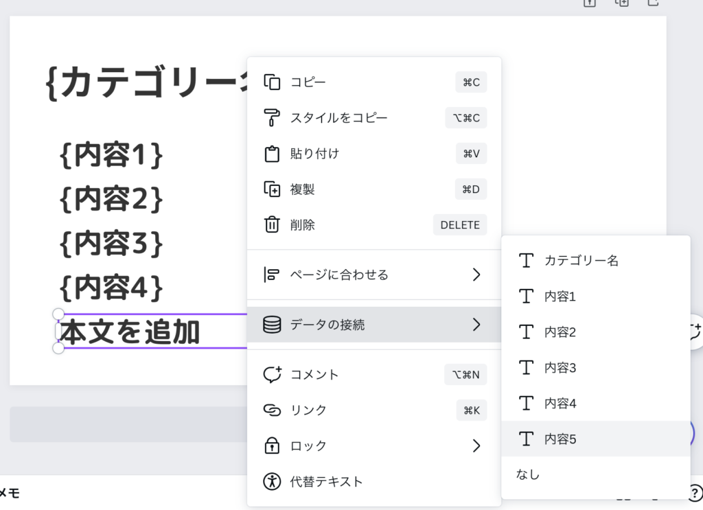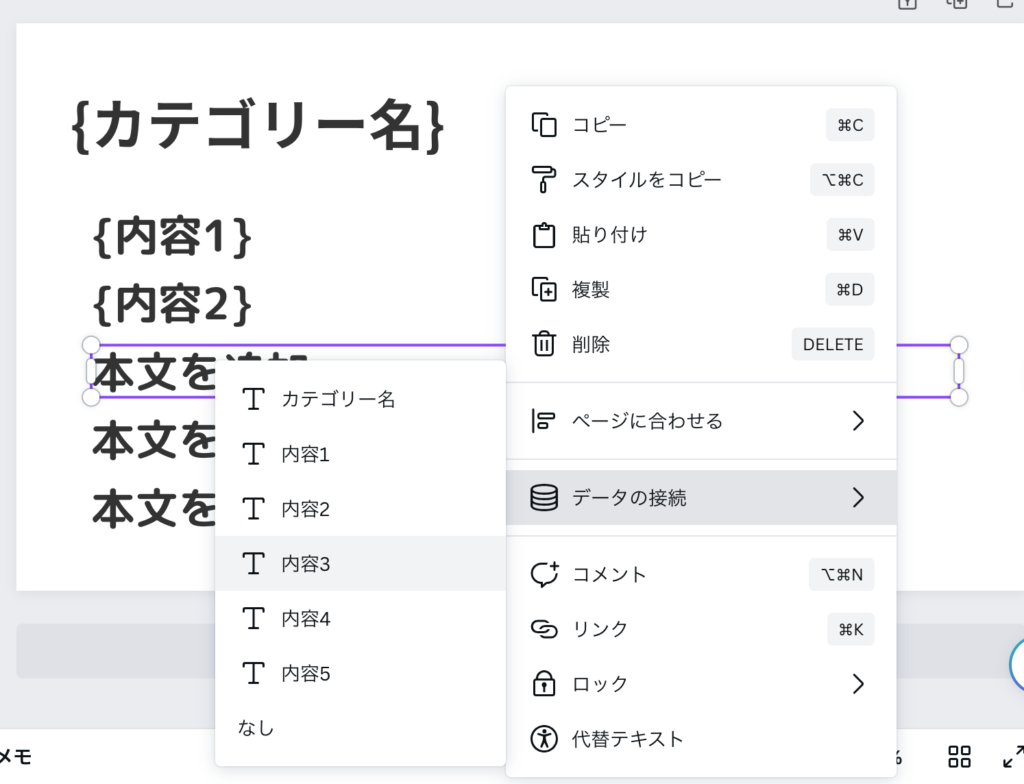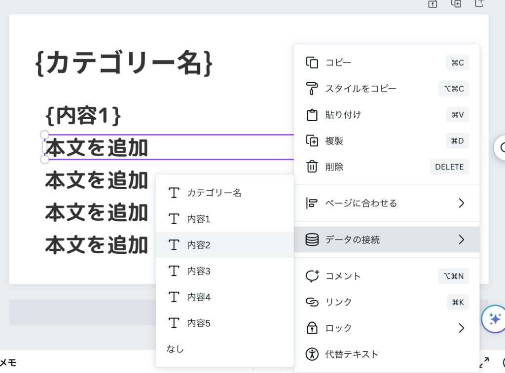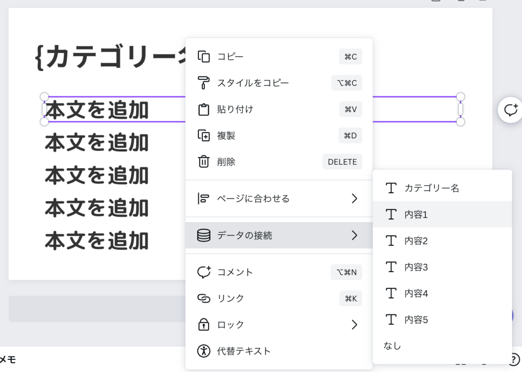 次に今、入力したデータとCanvaのテンプレートに入っている文章とを紐づけ(連携)させていきます。