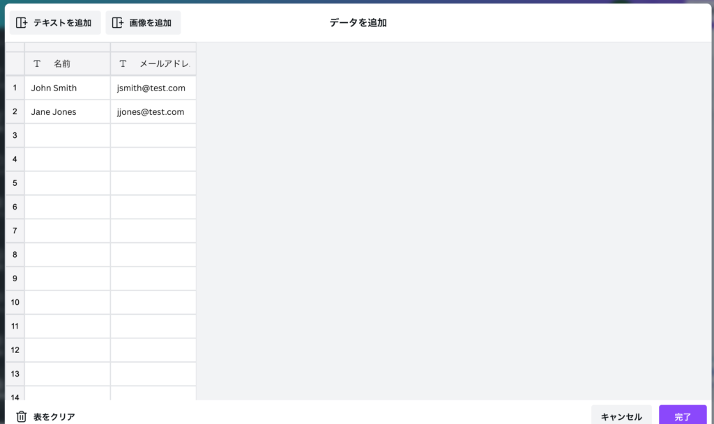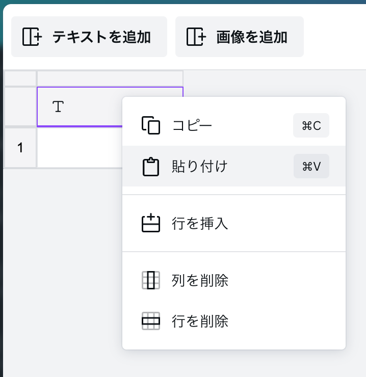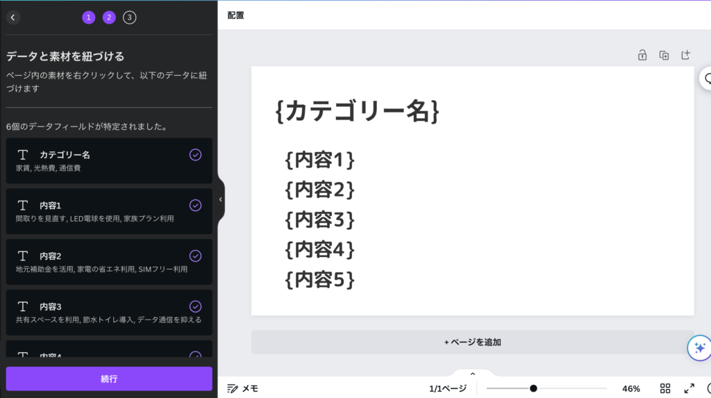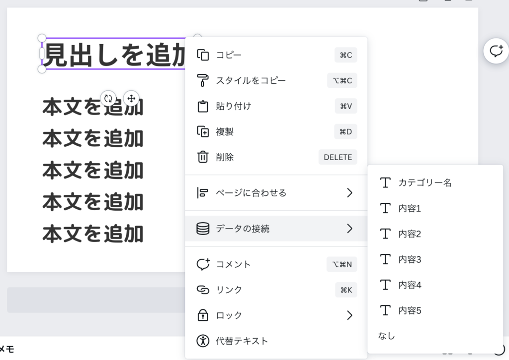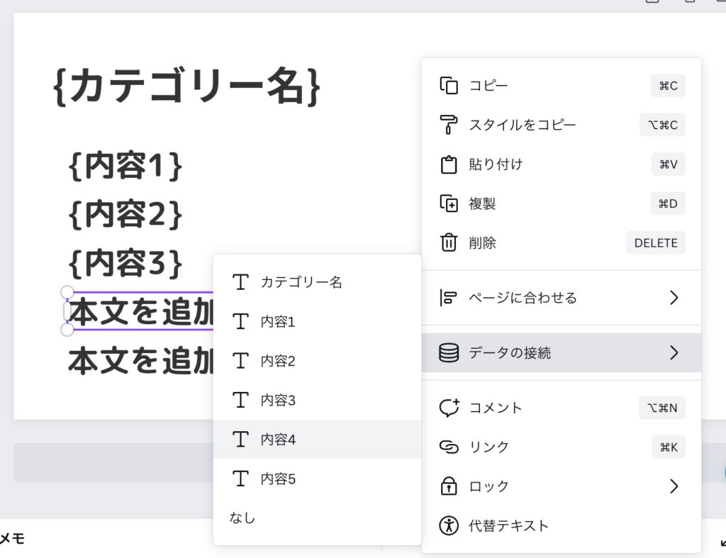 次に今、入力したデータとCanvaのテンプレートに入っている文章とを紐づけ(連携)させていきます。