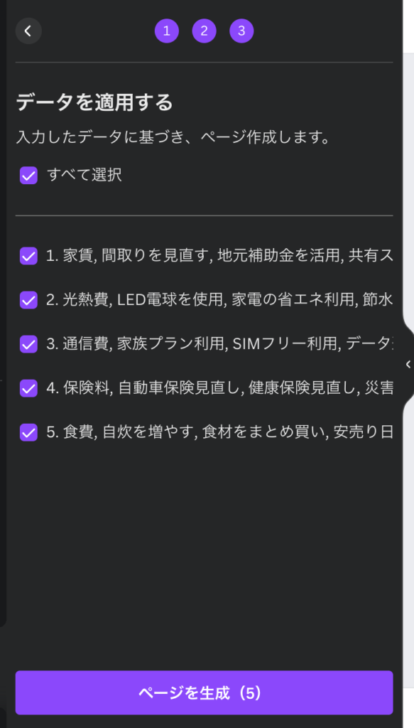 以下のように1枚目から5枚目にこういった内容で画像を作りますよ〜、と表示されるので、問題なければ「ページを生成」をクリック。
