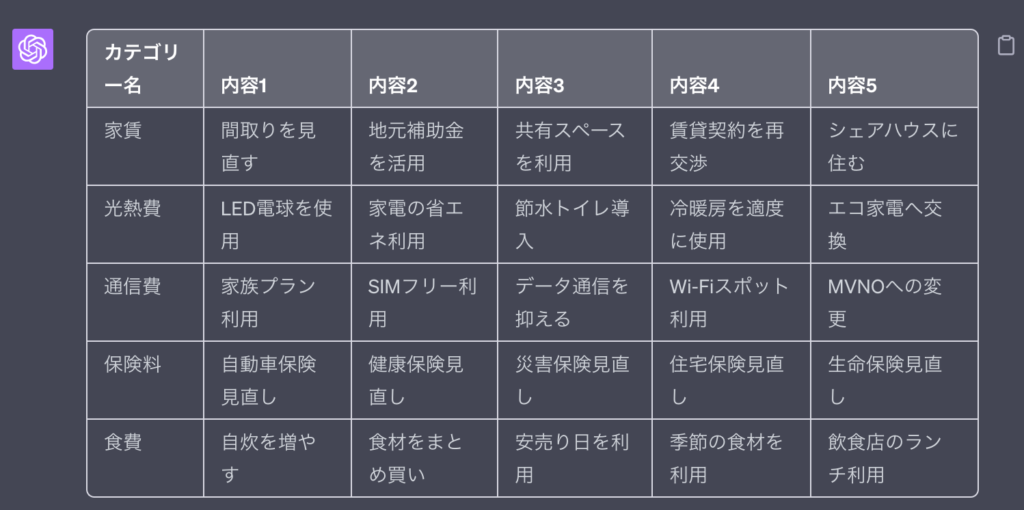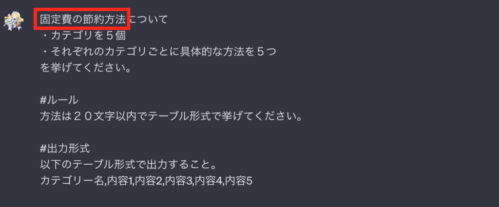 質問欄に呪文を貼り付け、○○の箇所に「固定費の節約方法」と入力し、送信します。