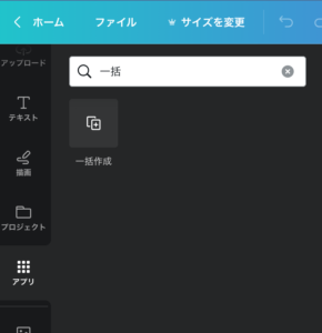 Canvaのメニューから「アプリ」を選び、検索窓に「一括」と入力すると、一括作成のアプリが表示されるので、そちらをクリックします。