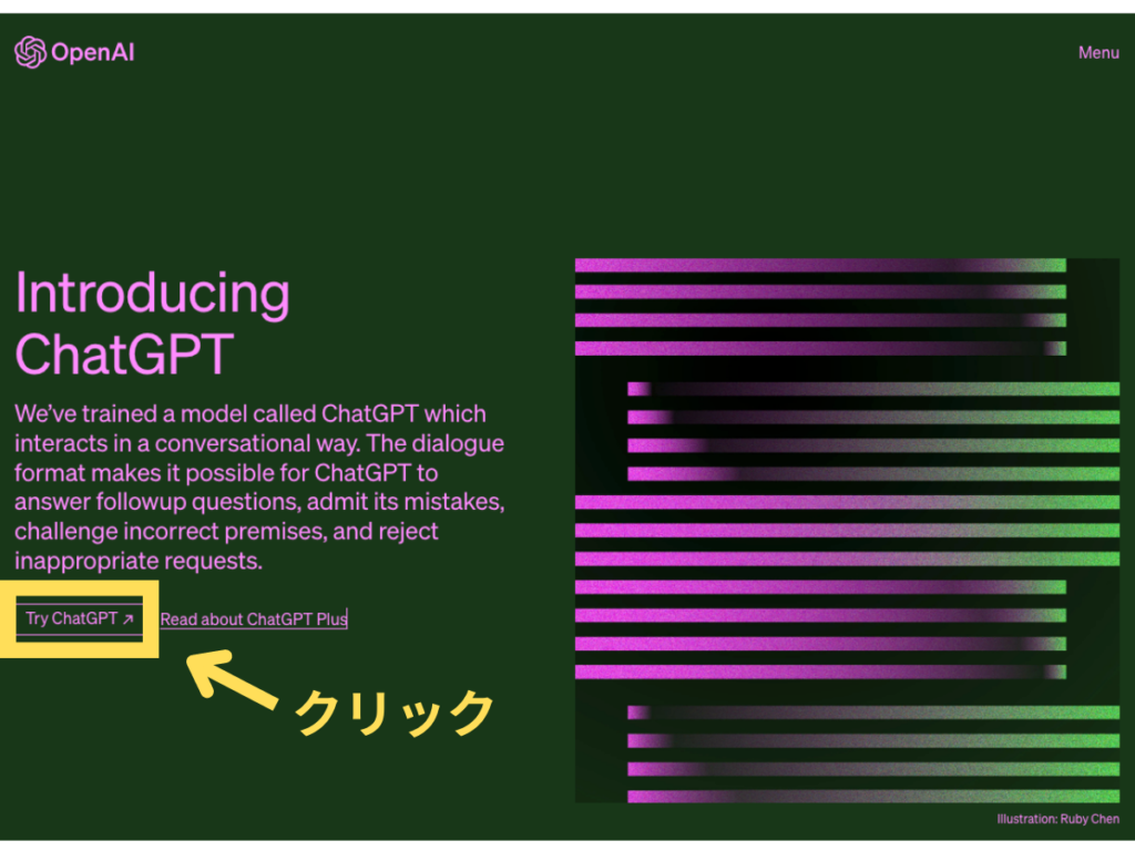 こちらのページにアクセスして、Try chatGPTをクリックする。