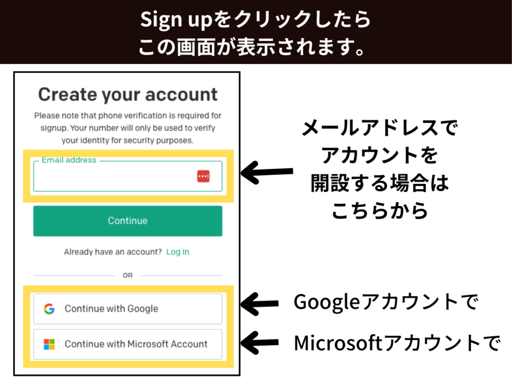 の3種類があるので、お好きな方法で開設してください。ちなみに私は「Googleアカウント」を使って開設しています。