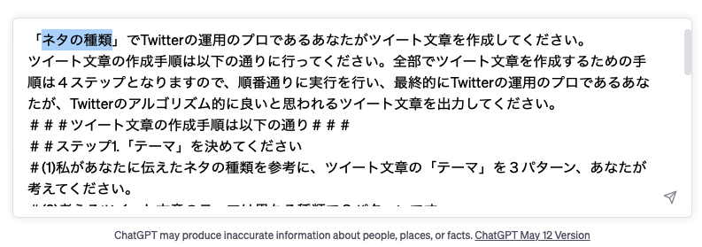 chatGPTのモデル3.5の場合、言うことを聞いてくれないケースが多々起こる可能性があるため、2023年5月13日までに公開していた初期のツイート魔法を改良しました。