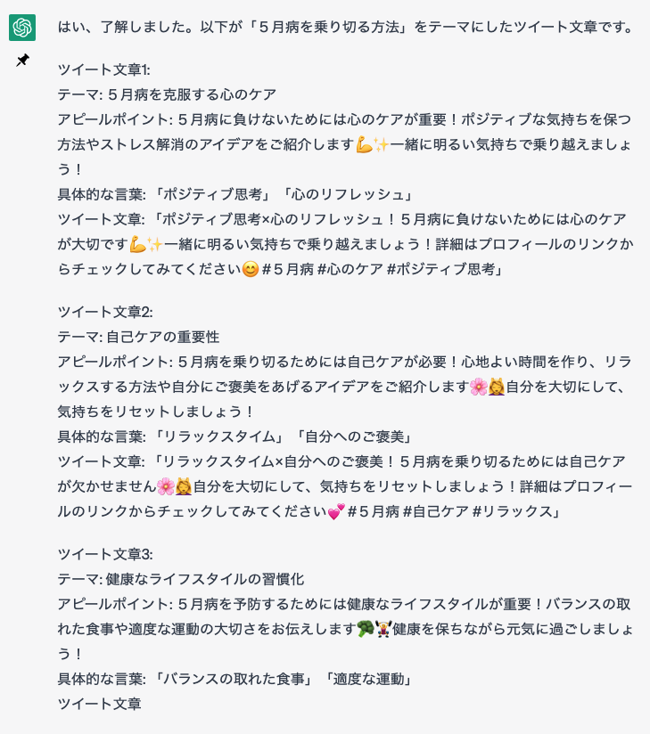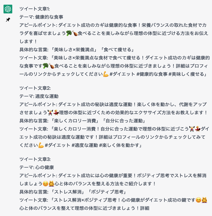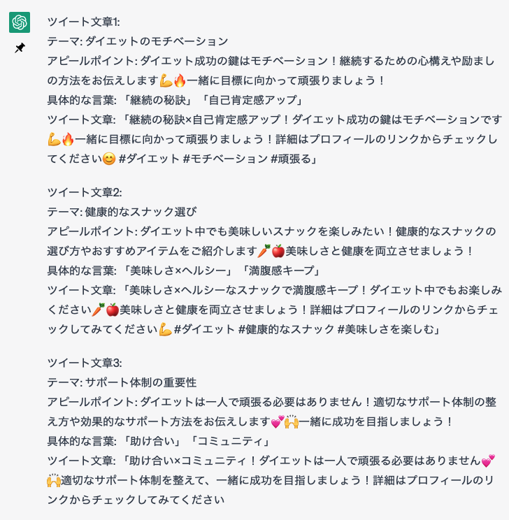 すると、後はchatGPTが勝手に指示したネタの種類で3テーマを考え、それぞれでツイート文章を作成してくれます。