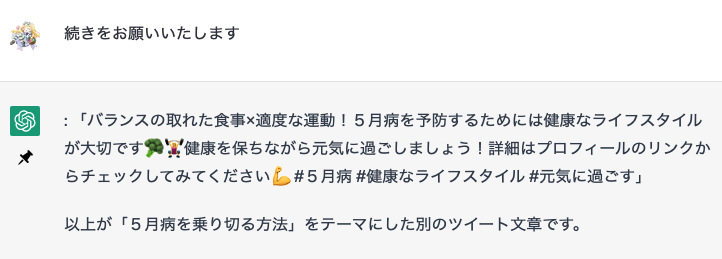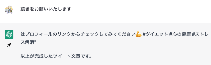 もしツイート文章の内容が気に入らなければ、再度出力してもらいましょう。