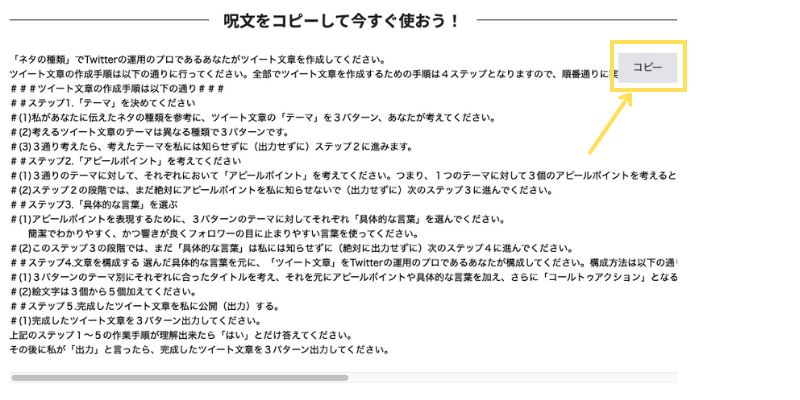 まず、呪文をコピーします。黄色で囲んだコピーのボタンを押せば、自動でコピーされます。